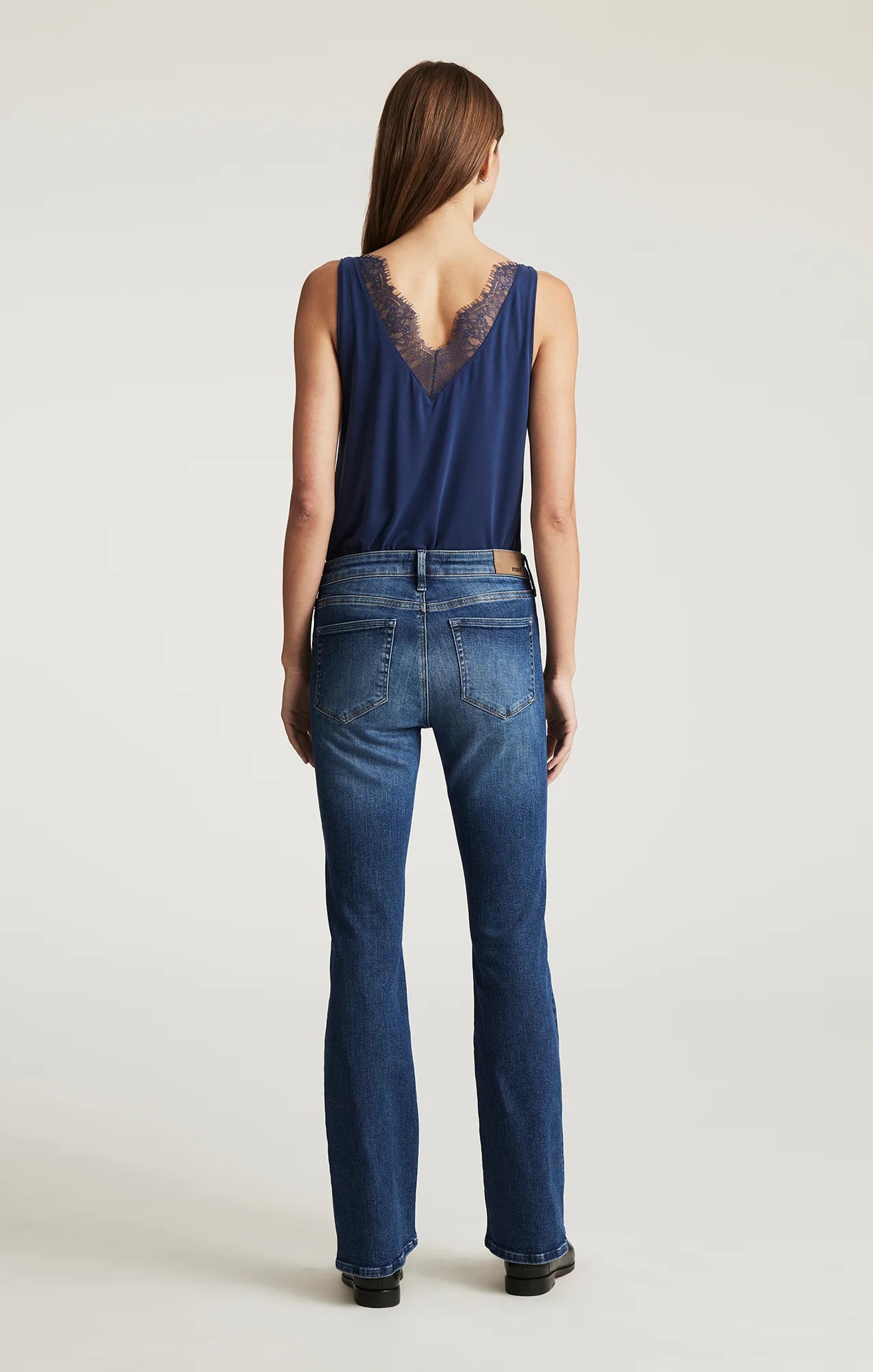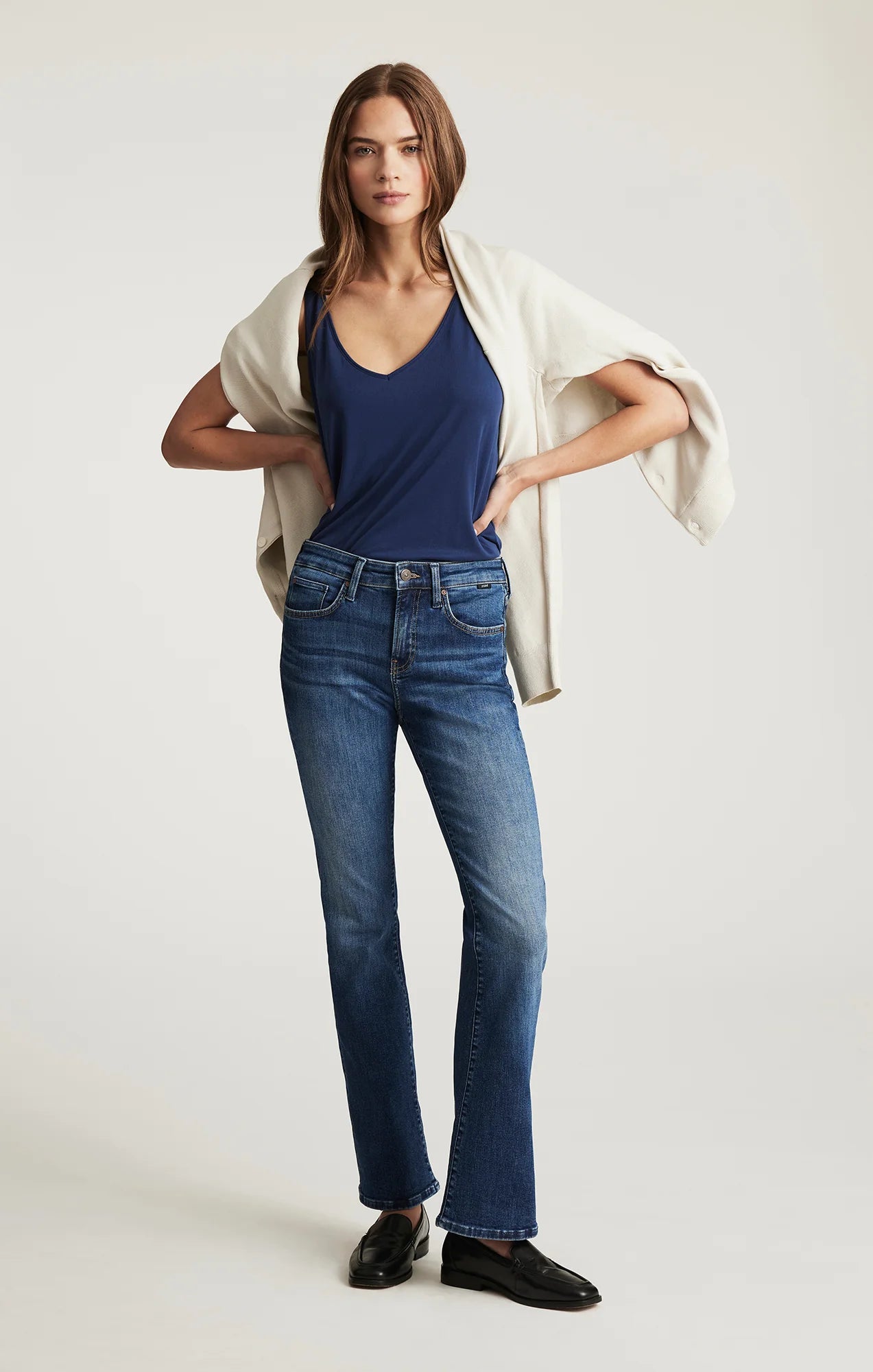 Vicky offers a more pronounced bootcut with a leg-lengthening flare. The flattering fit and easy mid rise provide a perfect balance between style and comfort. This pair features a classic dark wash with whiskering and a perfectly worn-in finish.