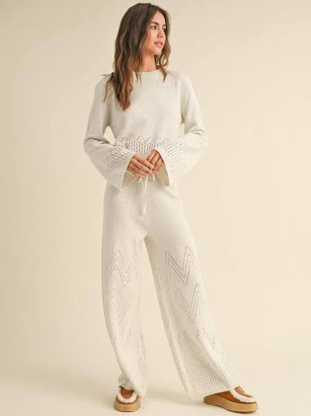 This oatmeal-colored border crochet knit top offers a chic way to enjoy comfort. With its unique design, it flatters every woman beautifully. Made from high-quality materials, this sweater is incredibly comfortable. Don't forget to pair it with the matching bottoms to complete your stylish ensemble!