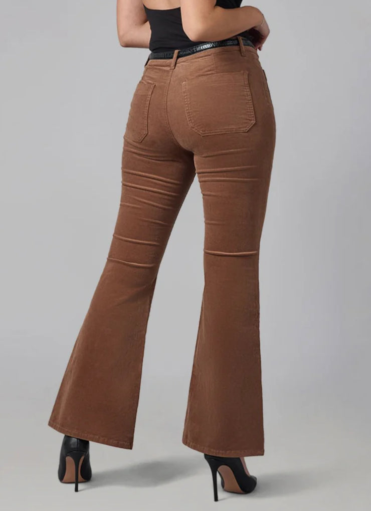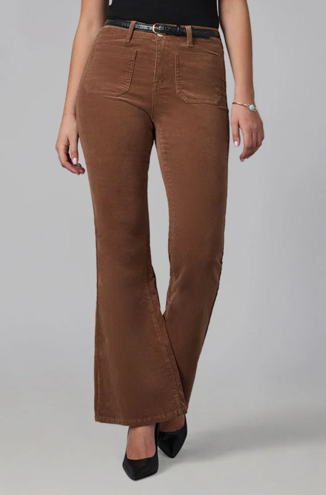 The high rise Alice Cord offers a bit of stretch and a flared silhouette and flat pockets. Sure to be your go to pants in the fall and winter.