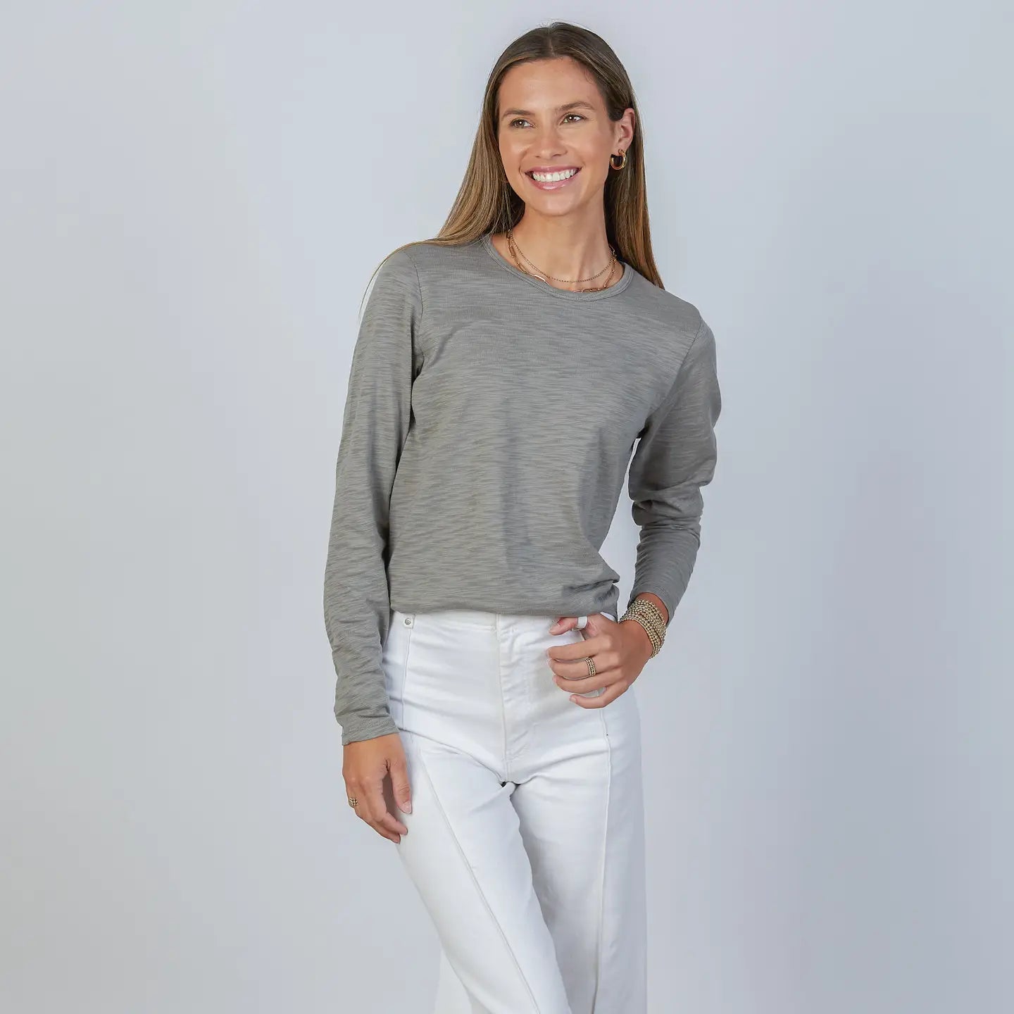 Our Best Selling Classic Pima cotton long sleeve tee! With a new flattering length, this super comfy and stylish long sleeve tee is perfect for every occasion, especially with your favorite pair of jeans.